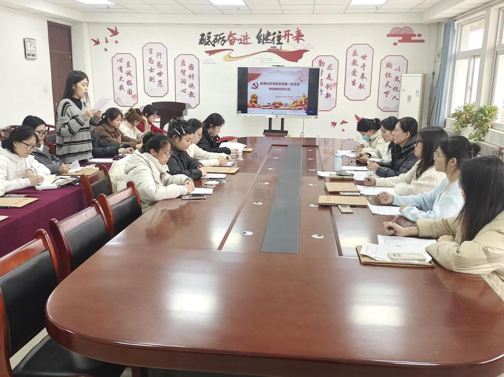 接着,员工第一党支部进行了预备党员转正大会。首先,丁梦蕾、郭思琪等4名预备党员在汇报中表明会牢记党的初心和使命,以实际行动践行党的宗旨,向党组织交上一份满意的答卷。随后,培养联系人胡怡铭老师介绍了各预备党员在预备期间的表现,并对转正的预备党员表明态度,愿她们成为正式党员以后能坚定信仰,全心全意为人民服务,继承党的优良传统,在新时代发光发热。经拥有表决权的正式党员投票后,一致同意丁梦蕾、郭思琪等4名预备党员同志按期转为中共党员。最后,员工第一党支部书记杨晶晶老师宣布了大会决议,她希望各位党员认真履行党员义务,深入学习党的路线方针政策,坚定共产主义理想和中国特色社会主义信念,始终保持政治上的清醒和坚定。