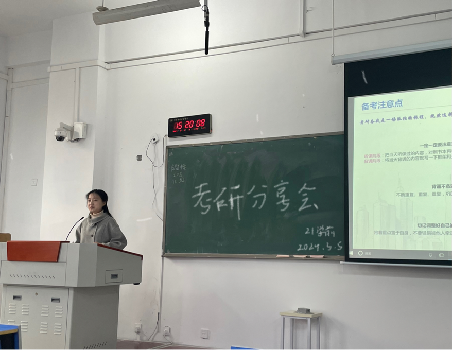 会上,毛秋月和郭雨晴同学分别从择校、信息收集、学习方式方法和心理调节几个方面对考研期间遇到的问题进行了全面细致地讲解,同学们受益良多。随后同学们针对考研相关的困惑提出问题,郭雨晴、毛秋月同学为大家进行了答疑解惑。