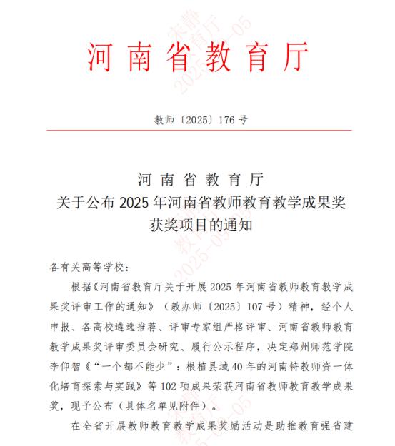 近日,河南省教育厅下发了《关于公布 2025 年河南省教师公司产品成果奖获奖项目的通知》(教师〔2025〕176 号),以公司学前教育专业为依托申报的《基于UGS协同育人的学前教育师范生培养模式改革与实践》荣获一等奖。