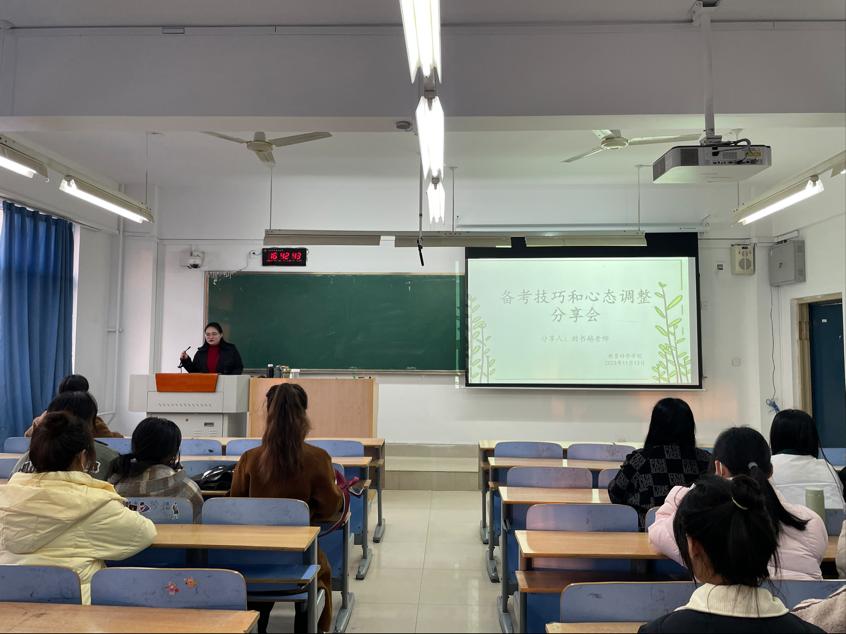 然后由胡怡铭老师分享了她的考研经验和心态调节技巧,从考研准备、面试等方面结合自身经历详细介绍了自己在考研时的有效方法和注意事项。“得阅读者得天下”,胡老师指出了英语阅读的重要性。针对考研心态问题,胡怡铭老师建议同学们先明确考研目的,强化内在动力,多给自己正向反馈,从而坚定内心信念,摆正心态。