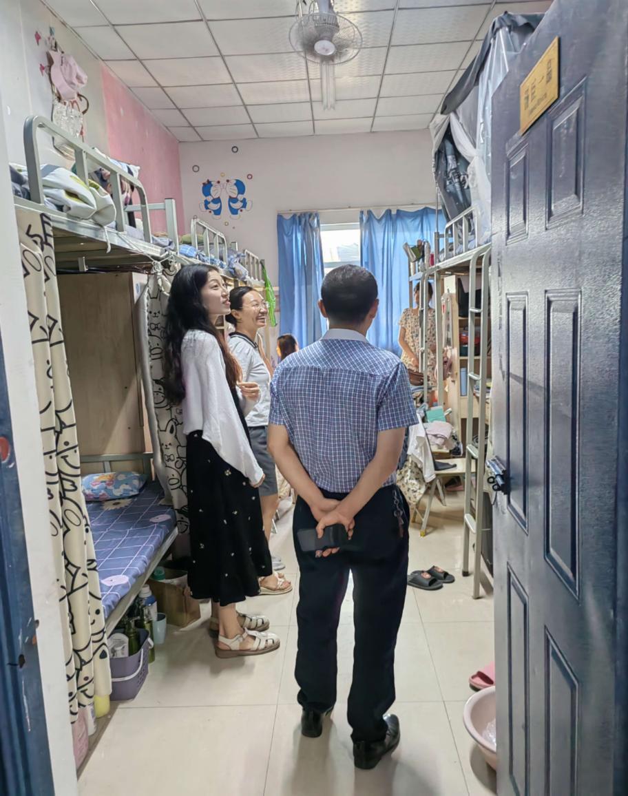 为深入了解员工的学习生活状况,加强师生间的沟通交流,2024年10月8日,教育科学公司党总支书记王德彬、副书记蔡颖、辅导员杨晶晶、胡怡铭、刘书越和唐楠一起深入员工宿舍进行走访。